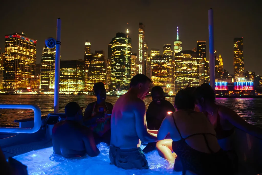 Hot Tub Boat Cruises glide along the Hudson River while passengers relax in steaming water surrounded by open air skyline views. Warm bubbles. Cool night air. Skyscrapers rising all around you. It feels oddly surreal – like floating through a luxury spa that happens to be moving past one of the world’s most famous cityscapes!