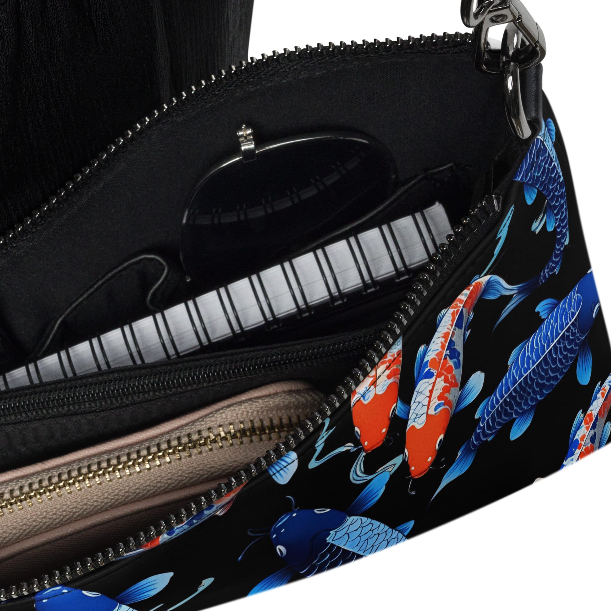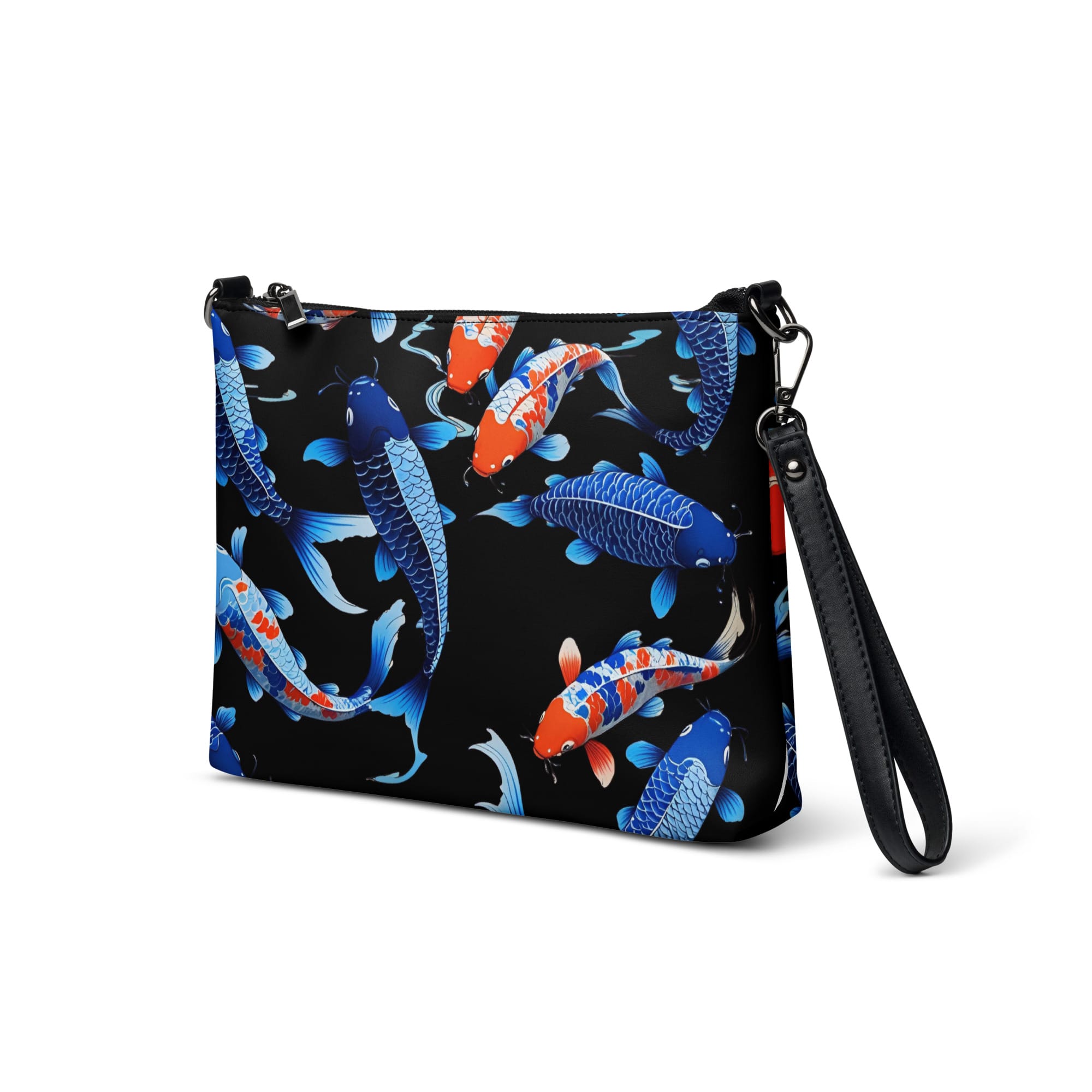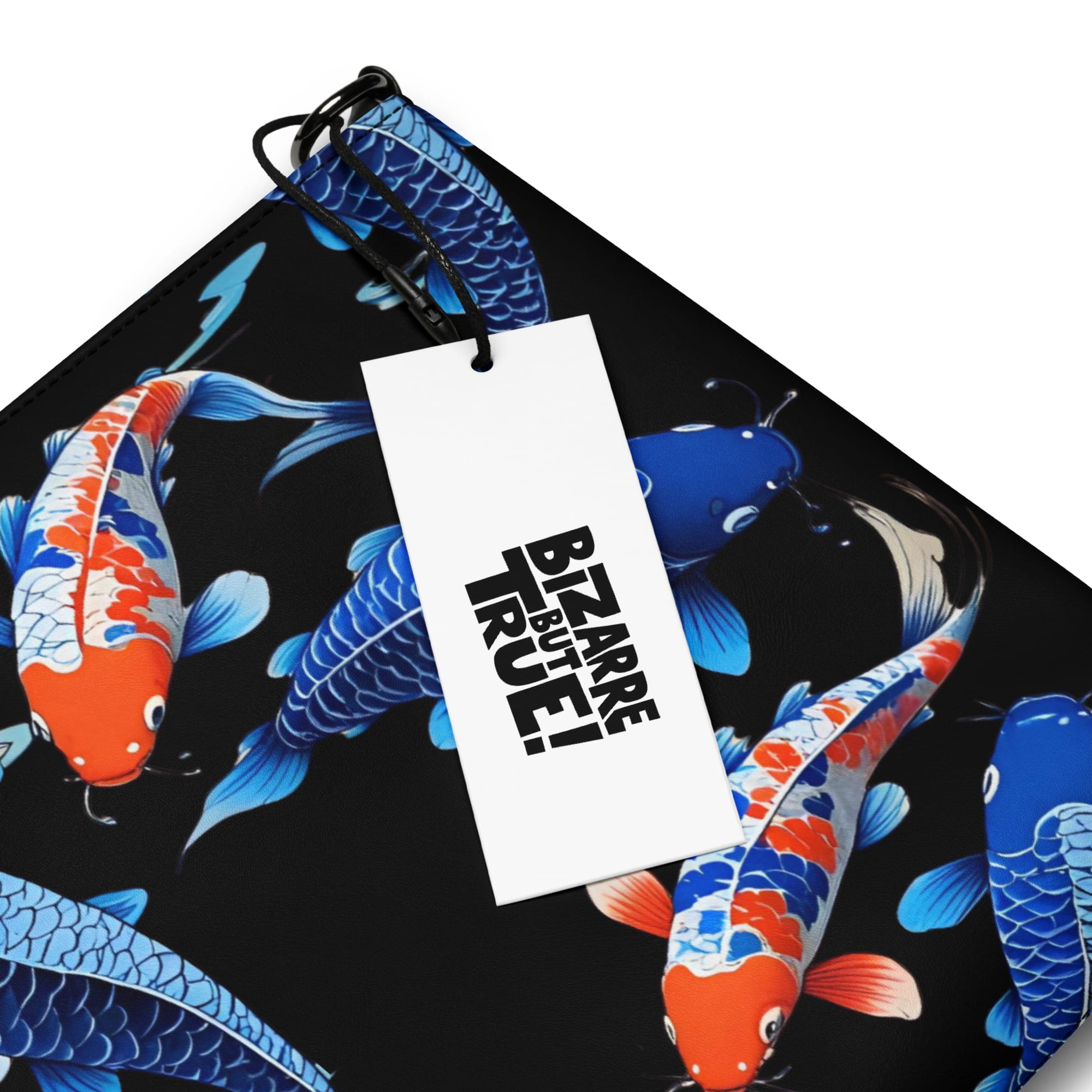 Meet our ‘Koi Legends’ Crossbody Unisex Handbag. Sleek with vibrant koi flaring against a deep black backdrop. Perfect for the fish lover in you. Or those with legendary aspirations of their own.